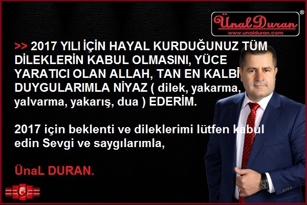 2017 için beklenti ve dileklerimi lütfen kabul edin Sevgi ve saygılarımla, ÜNAL DURAN.
