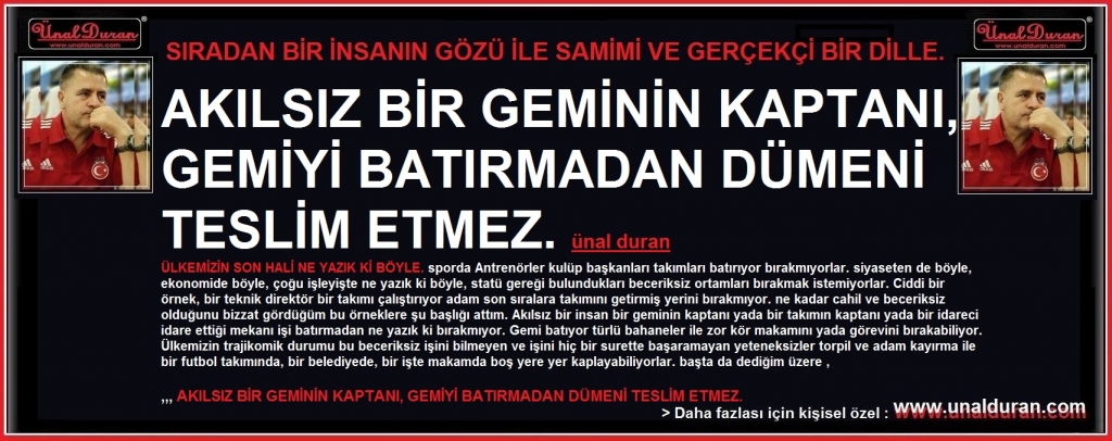 ÜLKEMİZİN SON HALİ NE YAZIK Kİ BÖYLE sporda Antrenörler kulüp başkanları takımları batırıyor bırakmıyorlar. Siyaseten de böyle, ekonomide böyle, çoğu işleyişte ne yazık ki böyle statü gereği bulundukları beceriksiz ortamları bırakmak istemiyorlar. Ciddi bir örnek, bir teknik direktör bir takımı çalıştırıyor adam son sıralara takımını getirmiş yerini bırakmıyor. Ne kadar cahil ve beceriksiz olduğunu bizzat gördüğüm bu örneklere şu başlığı attım. Akılsız bir insan bir geminin kaptanı ya da bir takımın kaptanı ya da bir idareci idare ettiği mekânı işi batırmadan ne yazık ki bırakmıyor. Gemi batıyor türlü bahaneler ile zor kör makamını ya da görevini bırakabiliyor. Bu örneği vererek aslında ülkemizin kanayan bir yarasına biraz olsun parmak basmak istiyorum. Ülkemizin trajikomik durumu bu beceriksiz işini bilmeyen ve işini hiç bir surette başaramayan yeteneksizler torpil ve adam kayırma ile bir futbol takımında olsun, bir belediyede, bir işte makamda boş yere yer kaplayabiliyorlar. Başta da dediğim üzere ne yazık ki akılsız bir geminin kaptanı, gemiyi batırmadan dümeni ne yazık ki teslim etmiyor. Bu olumsuzluklara bire olumlu bakış yapmış olursam.
