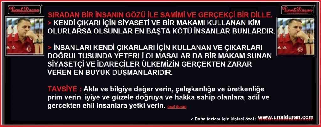 > İNSANLARI KENDİ ÇIKARLARI İÇİN KULLANAN VE ÇIKARLARI DOĞRULTUSUNDA YETERLİ OLMASALAR DA BİR MAKAM SUNAN SİYASETÇİ VE İDARECİLER ÜLKEMİZİN GERÇEKTEN ZARAR VEREN EN BÜYÜK DÜŞMANLARIDIR.